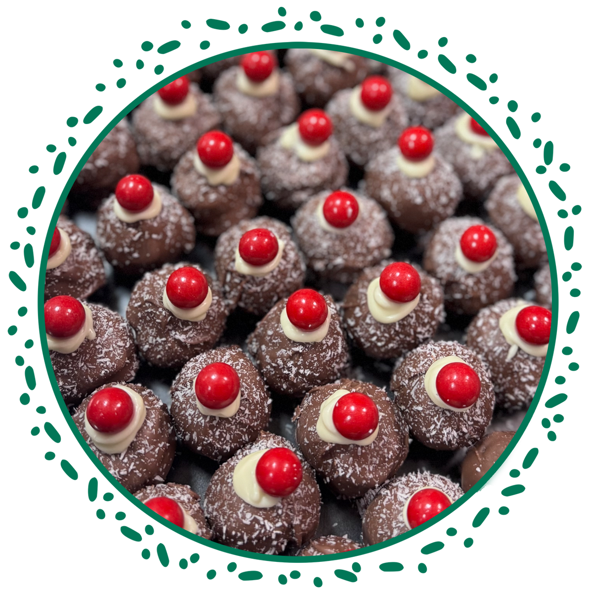 Our legendary Christmas Rum Balls are infused with Bundaberg Small Batch Rum, hand-rolled, chocolate-dipped, and finished with coconut, white chocolate, and a single jaffa on top.