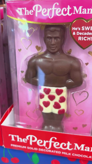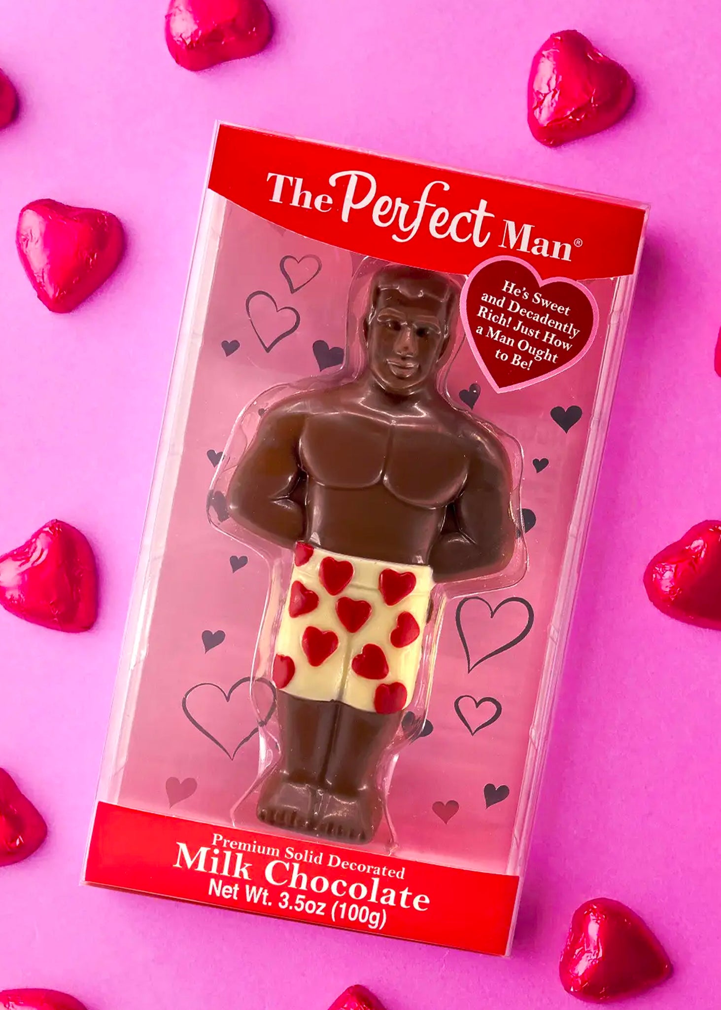 Who needs roses when you can have the Perfect Man! Made from smooth milk chocolate, this choco-hunk comes strutting in his heart-print shorts, muscles on display and ready to charm. Available in two sizes, he’s guaranteed to raise a smile, turn heads, and become the most talked-about cheeky gift!