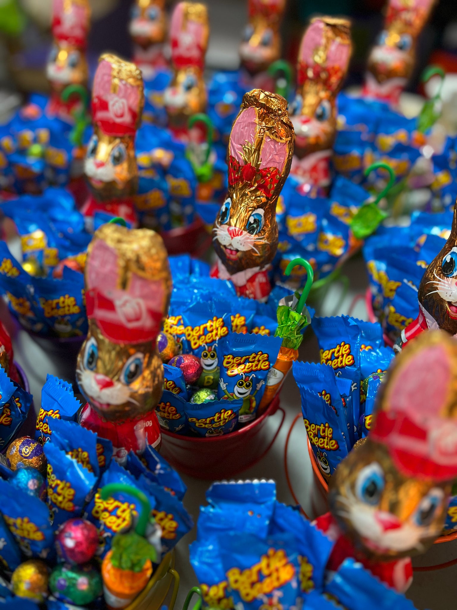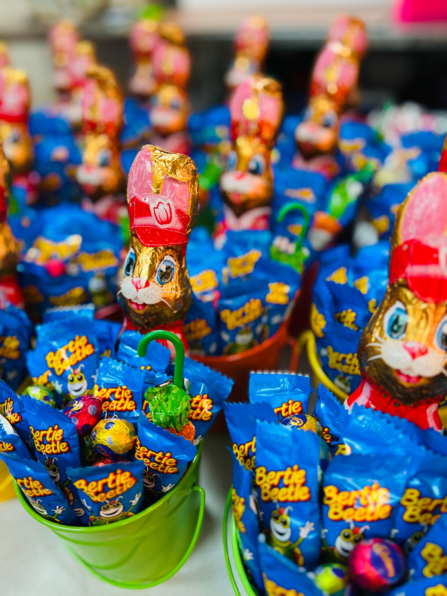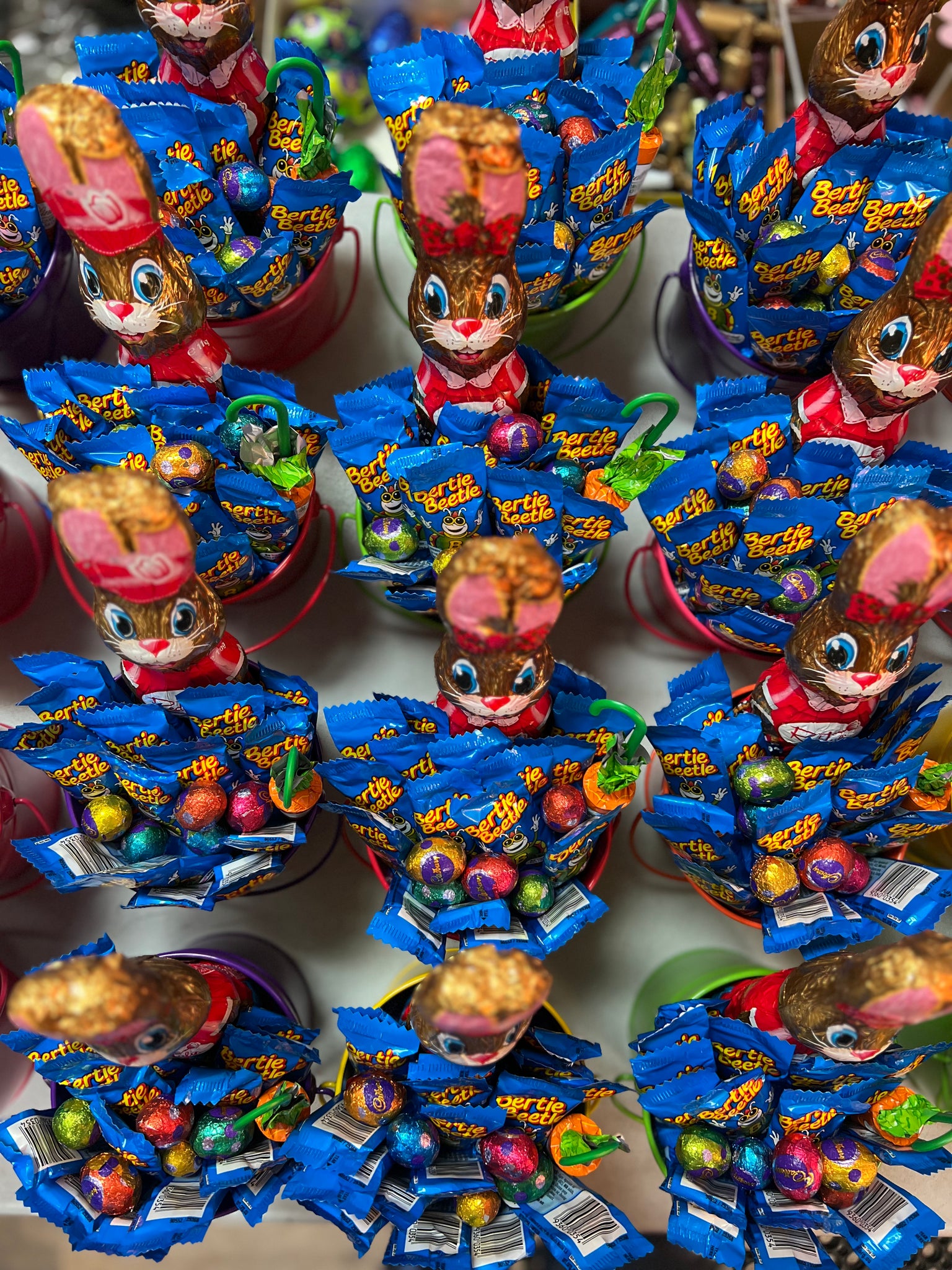 Our Bertie Beetle Bucket Bucket includes 1 Red Tulip Bunny,Chocolate Carrot & 17 Bertie Beetles & Cadbury Eggs. Wrapped in cellophane with a beautiful